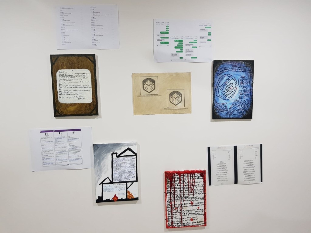 The experimental component was three-fold; timeline, medium, and charachter. Not sure if ‘enjoy’ is the right term for this, but see what you think anyway. It comes in several parts, al of which had visual components as well. For the parts in which the written words aren’t so obvious, the text will follow the visual. This is what it looked like as a whole project, and as a caveat – I’m not an artist please don’t judge me too harshly for the paintings!